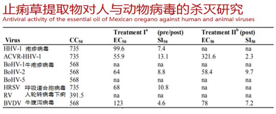 针对目前非洲猪瘟肆虐,业界凛凛寒冰,苦无对策之时,公司技术总监袁保京博士也总结了国外对好力高(止痢草提取物及其主要活性成分)对病毒杀灭与抑制的研究成果,袁博士指出,好力高及其有效活性成分可以有效杀灭或抑制流感病毒(H1N1), 牛与人孢疹病毒,人呼吸道合胞病毒与轮状病毒,牛病毒性腹泻病毒,猪流行性腹泻病毒等(下图)。至于对猪非瘟病毒的研究正在进行中,希望早日与各位业界同仁分享研究成果。