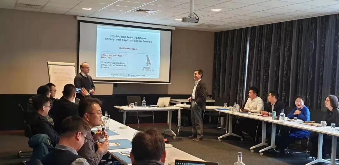 访问团首日进行了圆桌会议,荷兰SFR饲料研究所的专家们分享了--荷兰畜牧业生产概述:事实和数据;实现高技术性能和在动物饲养中保持饲料成本低的关键?将来有哪些挑战和机遇,未来将会如何?荷兰为非洲猪瘟做了哪些应对准备?无抗和低锌(仔)猪料——欧洲经验详谈及如何制定配方等。来自欧洲Ioanna大学的副教授Bonos博士作了题为《植物饲料添加剂:理论及在欧盟的实际应用》的讲座,Bonos博士及其团队也是美瑞泰科的欧洲研发合作伙伴,从二十多年之前就开始研究植物提取物添加剂,他从植物提取物添加剂的筛选(最终选用止痢草提取物)、抗菌杀菌的功效及其作用机制、在动物生产上的试验研究总结以及无抗营养与饲料中使用止痢草提取物的经验与影响使用效果的因素,一一剖解、娓娓道来。