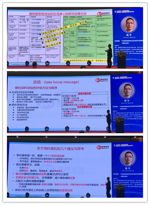 6日,美瑞泰科华南区技术与客户服务总监杨平硕士在会议上分享了《植物提取物在无抗饲料与动物营养中理论实践》。课题中介绍到,自2006年开始,欧盟全面禁止在饲料中使用抗生素,欧盟成员国在禁抗之后也都遇到了不同的挑战,如丹麦在禁抗后,猪的发病率和死亡率显著增加,11%的育肥猪(35kg以上的)腹泻率增加,增重变缓,治疗用抗生素增加;英国肉鸡在禁抗后则出现均匀度下降,次品率升高,总体造肉成本升高,肠道健康变差等问题。以上这些问题,也是我国在饲料禁抗以后必须要面对的难题。